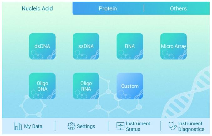 Built-in common calculation formula of dsDNA, ssDNA, RNA, Oligo-DNA, Oligo-RNA, can get the concentration and purity of samples automatically.