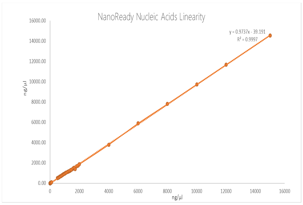 The 0.03 minimum detection path length, combined with a new generation spectrophotometer, increases the maximum detection concentration to 27,500 ng/μl and the lowest detection concentration as low as 0,2 ng/μl